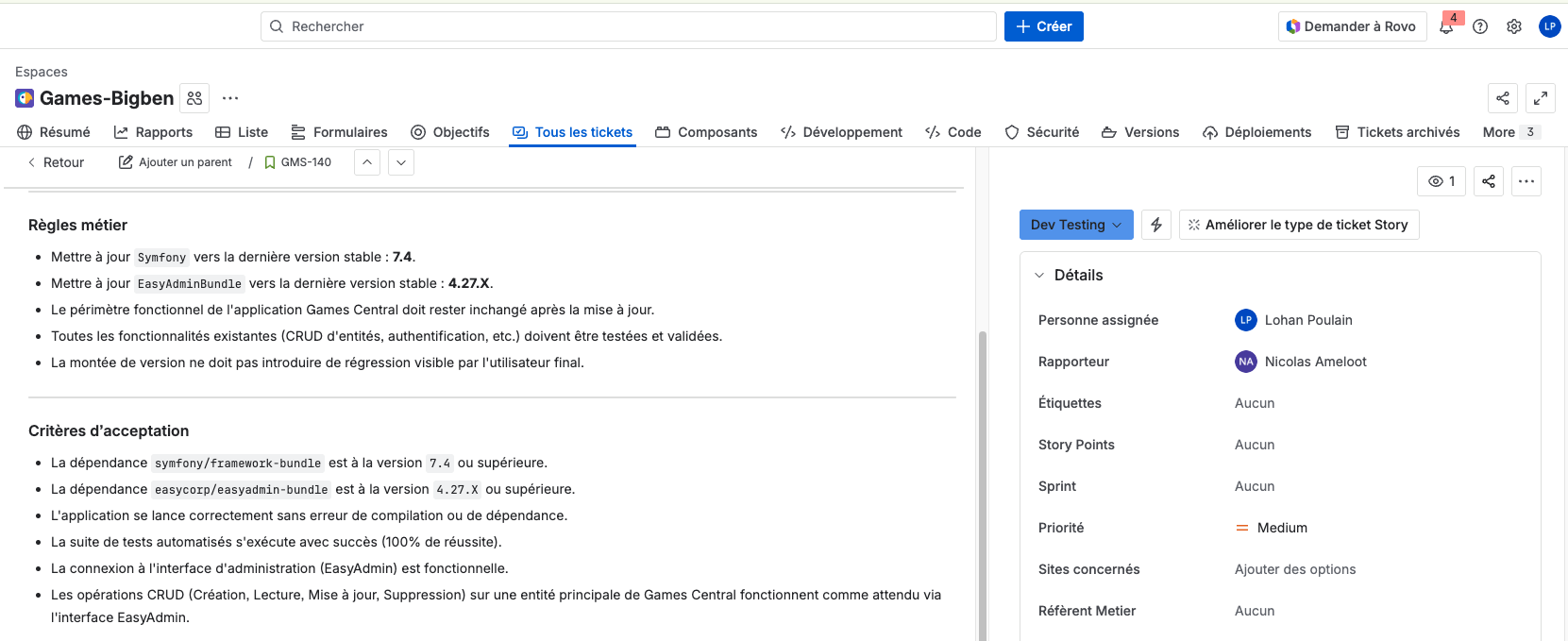 Un ticket m'a été confié afin de réaliser la mise à jour du framework Symfony et du bundle EasyAdmin vers leurs dernières versions stables. Cette évolution technique avait pour objectif d'améliorer la sécurité, les performances et la maintenabilité de l'application, tout en conservant l'ensemble de fonctionnalités existantes.